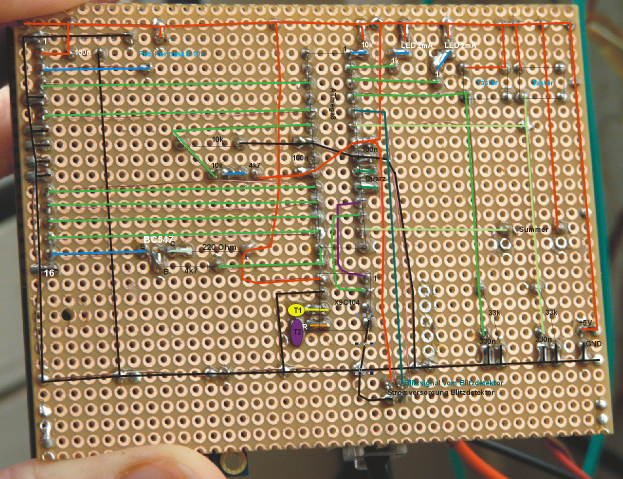 Der Prototyp wurde auf Lochrasterplatine aufgebaut, er enthält nur den Blitzzähler, nicht den Blitzdetektor! der Blitzdetektor wird separat per Kabel angebunden.