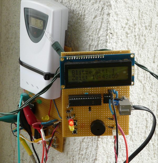 Da ich gerade mit der Programmierung von Microcontrollern als Hobby begonnen hatte, schien mir dies ein geeignetes Projekt. Die Hardware beschränkte sich auf ein Minimum (s. Teileliste), und alles sollte auf einer Lochrasterplatine realisierbar sein. In einem zweiten Schritt konnte ich sogar einen Temperaturfühler meiner Wetterstation anschließen, die eine Aufzeichnung der registrierten Entladungen pro Minute erlaubt.