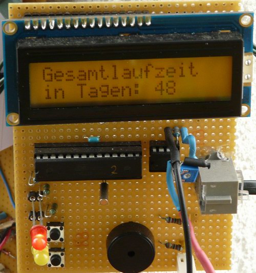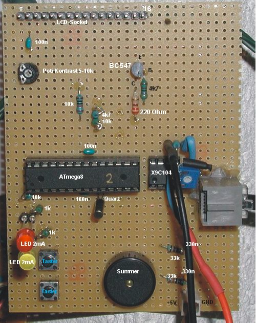 Zentraler Bestandteil des Zählers ist ein ATmega8, der die Daten auf einem kleinen LCD anzeigt und über einem programmierbaren Widerstand auf eine Wetterstation überträgt.